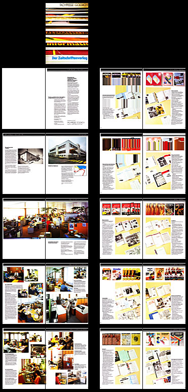 Diese Broschüre ist von Gottlieb Stalder gestaltet worden. Es handelt sich um ein Promotionsheft für das Unternehmen AVD Fachpresse Goldach, 1984 publiziert. In diesem Unternehmen war er von 1964 bis 1992 als Art Director tätig und hat das Gesicht des Verlages massgeblich geprägt. Auf Seite 9 der Broschüre sieht man den Künstler an seinem Arbeitsplatz, und auch zusammen mit einigen seiner Kollegen. Diese Publikation soll einen Eindruck geben, in welchem beruflichen und zeitgeschichtlichen Kontext das künstlerische Schaffen Gottlieb Stalders entstanden ist. - Als pdf Datei herunterladen, clicken Sie hier